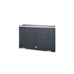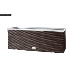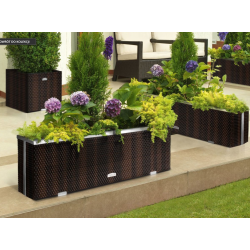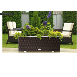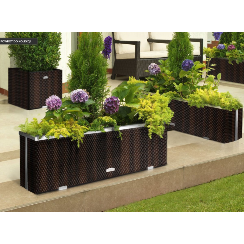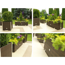 Wnętrze wykończone blachą ocynkowaną. Donica posiada dwie ozdobne listwy boczne na bokach oraz górne wykończenie wykonane z aluminium polerowanego. Technorattan cechuje się wysoką wytrzymałością i odpornością na warunku atmosferyczne takie jak np. wilgoć, mróz, zabrudzenia oraz promienie UV
